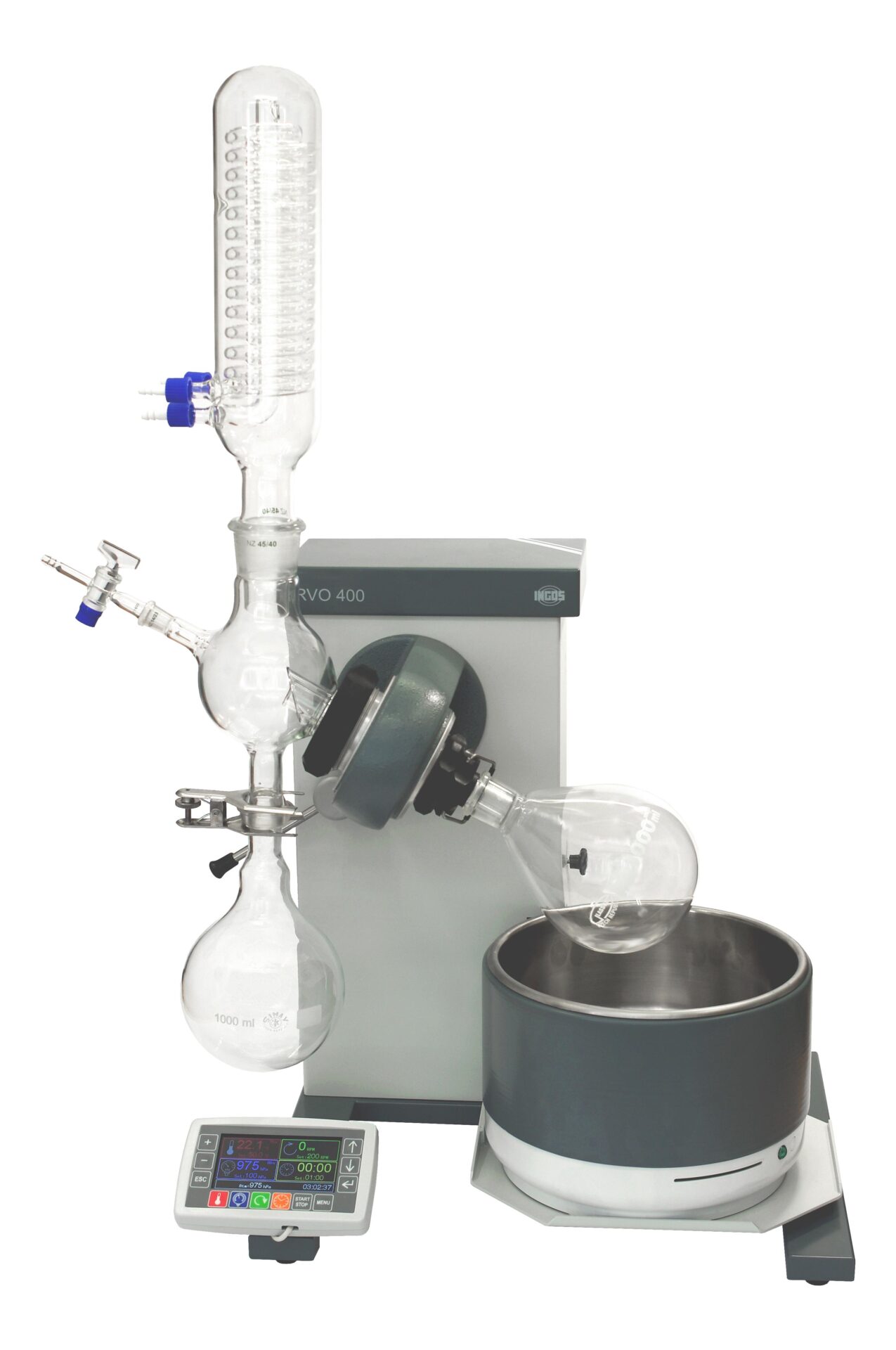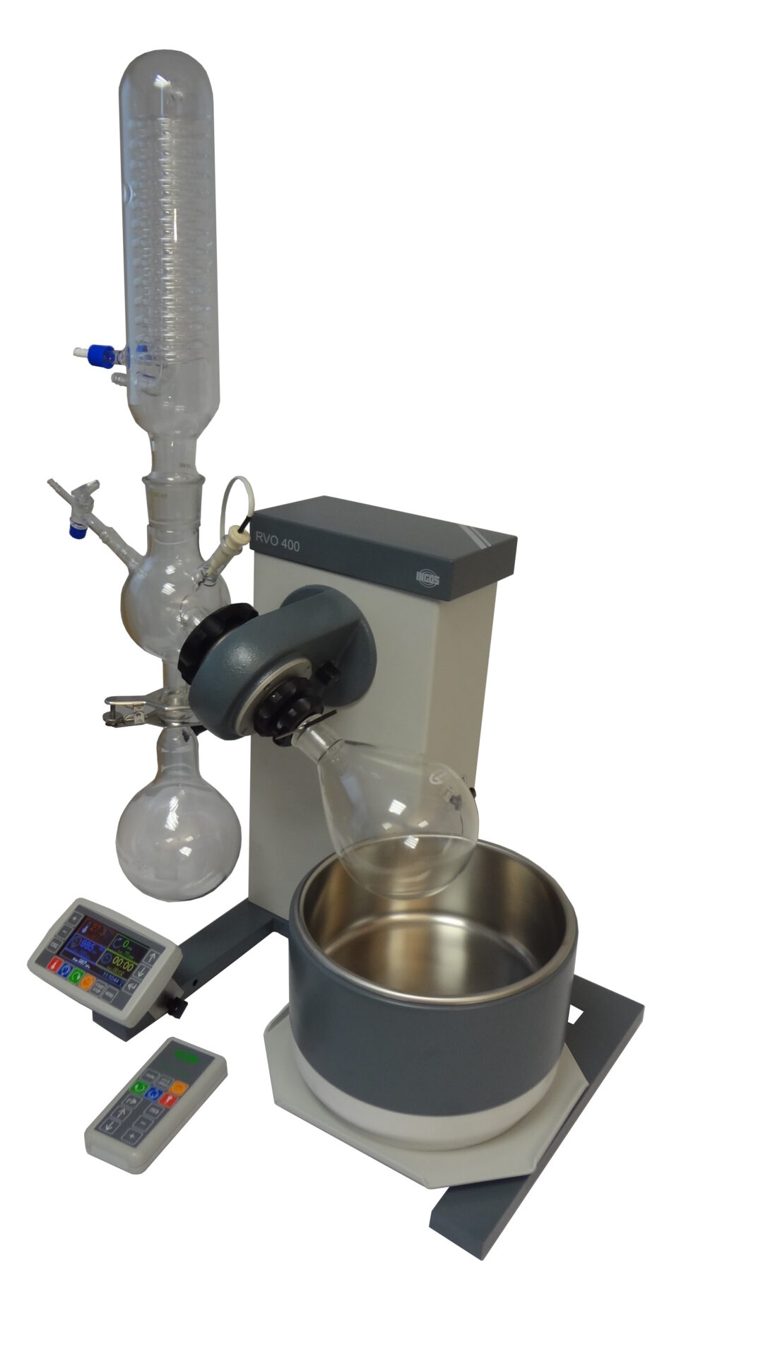 RVO 400 оснащений електричним підйомом ванни, точним контролем обертання і дозволяє використовувати колби об’ємом до 4000 мл. RVO 400 дозволяє регулювати температуру бані, швидкість обертання ротора та  робочий тиск, контроль вакууму, можливість використання бездротового дистанційного управління та інтуїтивно зрозуміле програмне забезпечення для евапорації.