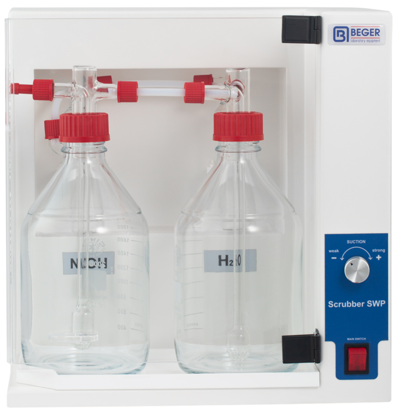 Скрубер SWP призначений для відведення та подальшої нейтралізації токсичних парів і газів, що утворюються при вигорянні зразка. Витягування парів здійснюється за допомогою вбудованого в скрубер вакуумного насоса, який витягує газ та направляє його в луг, де пари та газ нейтралізуються, а потім проходять додаткове очищення водою.